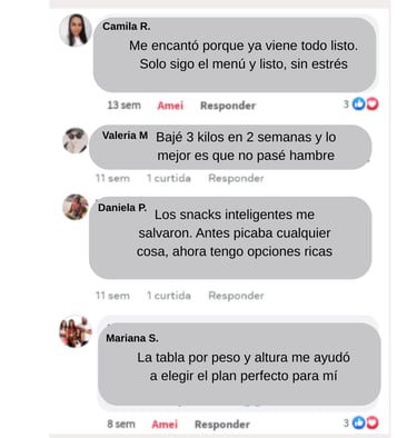 Diseñado para mujeres que desean perder peso con equilibrio y seguridad, este método incluye menús diarios cuidadosamente calculados de 1200 a 1900 calorías, organizados en desayuno, almuerzo, merienda y cena, para facilitar una alimentación saludable sin estrés ni cálculos diarios.
